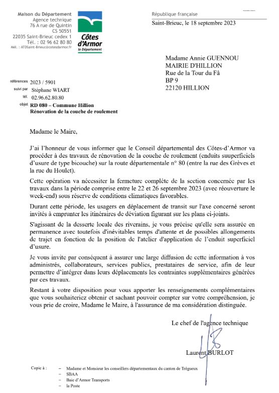 ⚠️ Travaux de rénovation de la couche de roulement (enduits suuperficiels d’usure de type bicouche) sur la route départementale n° 80 (entre la rue des Grèves et